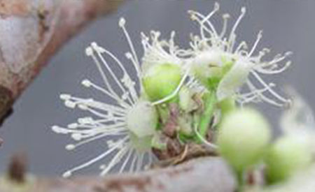 The jaboticaba is a slow growing large shrub or small, bushy tree. It reaches a height of 10 – 15 feet in California and 12 – 45 feet in Brazil, depending on the species. The trees are profusely branched, beginning close to the ground and slanting upward and outward so that the dense, rounded crown may attain an ultimate spread as wide as it is tall. The thin, beige to reddish bark flakes off much like that of the guava. The jaboticaba makes an attractive landscape plant.