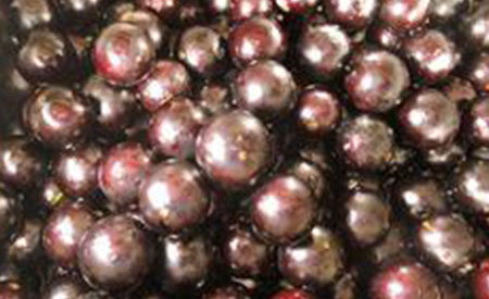 Jaboticaba fruit is grape-like in appearance and texture but with a thicker, tougher skin. Most California fruit is dark purple to almost black in color. Averages size is one inch in diameter but can run from 3/4 to 1-1/2 inches, depending on species and variety. The gelatinous whitish pulp contains from one to four small seeds and has a pleasant, subacid flavor markedly similar to certain muscadine grapes. The skin has a slight resinous flavor that is not objectionable. Fruit may be produced singly or in clusters from the ground up all over the trunk and main branches, and the plant may fruit up to five times per year.