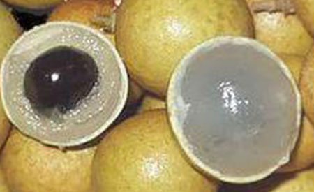 The pulp is whitish and translucent; thin in large seeded fruits and medium thick to thick in others. Fruit have 1 seed, globular and shiny, brown to dark brown. The pulp does not adhere to the seed and is flavorful and sweet . The time from flowering to harvest is 140 to 190 days.