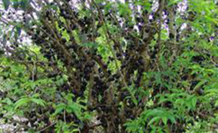 Jaboticaba fruit is grape-like in appearance and texture but with a thicker, tougher skin. Most California fruit is dark purple to almost black in color. Averages size is one inch in diameter but can run from 3/4 to 1-1/2 inches, depending on species and variety. The gelatinous whitish pulp contains from one to four small seeds and has a pleasant, subacid flavor markedly similar to certain muscadine grapes. The skin has a slight resinous flavor that is not objectionable. Fruit may be produced singly or in clusters from the ground up all over the trunk and main branches, and the plant may fruit up to five times per year.