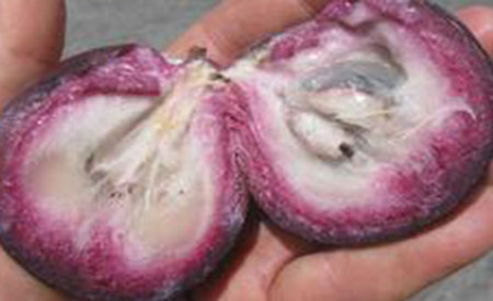 Caimitos are in season from late winter or early spring to early summer. They do not fall when ripe but must be hand-picked by clipping the stem. Be sure the fruit is ripe before harvesting. Unripe fruits will be gummy and inedible. A fully ripe Caimito fruit will have dull skin and slightly wrinkled.The fruit will be a little soft to the touch.